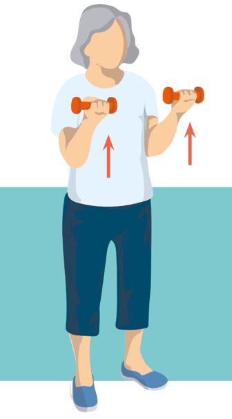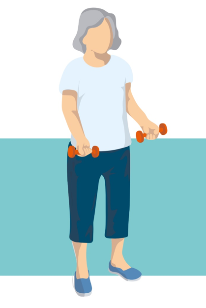 • Ohněte ruce v loktech a zdvihněte činky směrem k ramenům, poté je vraťte zpět podél těla.