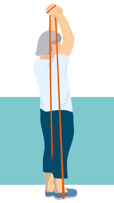 • Postavte se, gumu dejte pod pravou nohu, konce držte oběma rukama a natáhněte je směrem za hlavu.