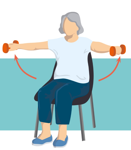 • Pomalu vydechněte a zvedněte obě paže do úrovně ramen pokud možno bez pokrčení loktů. Vydržte v této pozici 5 vteřin a s nádechem pomalu vraťte ruce podél těla.