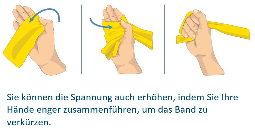 Halten Sie das Band fest oder wickeln Sie es um Ihre Hand oder Ihren Fuss, um zu verhindern, dass es sich löst und Verletzungen verursacht. Führen Sie die Übungen langsam und kontrolliert durch und achten Sie darauf, dass das Band nicht zurückprallt.