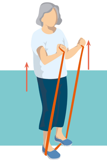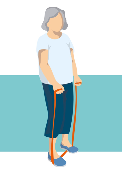 - Ziehen Sie das Band bis auf Brusthöhe, halten Sie dabei beide Arme eng an den Seiten und kehren Sie anschliessend in die Ausgangsposition zurück.
