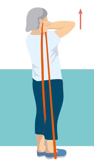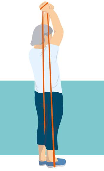 • Platzieren Sie das Band im Stehen unter dem rechten Fuss, halten Sie das Ende mit beiden Händen fest und ziehen Sie das Ende hinter den Kopf.