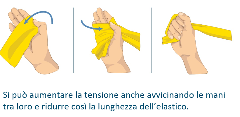 Afferri saldamente l’elastico oppure lo arrotoli intorno alla mano o al piede per impedirne l’allentamento ed evitare di incorrere in lesioni. Esegua gli esercizi in modo lento e controllato, evitando che l’elastico rimbalzi.