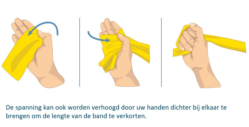 Pak de band stevig vast of wikkel hem om uw hand of voet om te voorkomen dat hij losraakt en mogelijk letsel veroorzaakt. Voer de oefeningen langzaam en gecontroleerd uit en laat de band niet terugschieten.