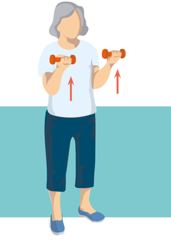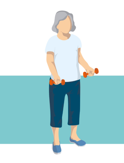 • Ruky ohnite v lakťoch a zdvihnite činky smerom k ramenám, potom ich spustite späť pozdĺž tela.